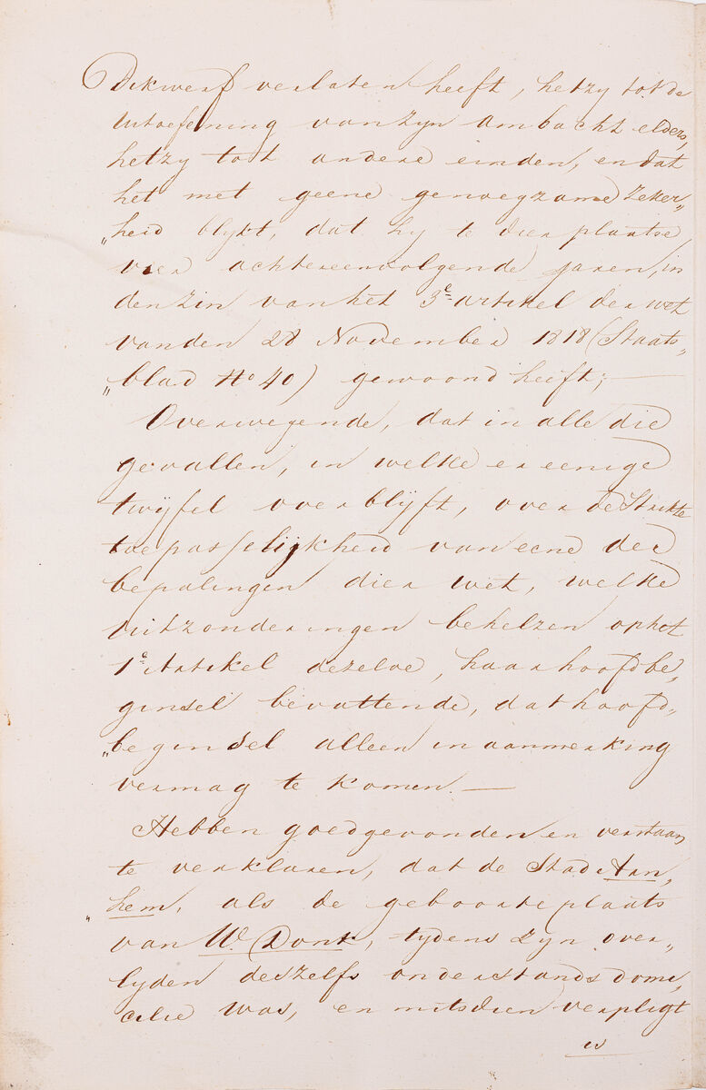 Het antwoord van de koning laat een jaar op zich wachten. In de tussentijd is Willem Donk zelf overleden, maar de gemaakte kosten moeten nog steeds betaald worden, en dus moet er eindelijk een beslissing genomen worden wie dat moet doen. Met deze brief laat Koning Willem I zijn beslissing aan de betrokken partijen weten. Het is een kopie, daarom staan er geen handtekeningen op, alleen “get[ekend]/ Willem”.