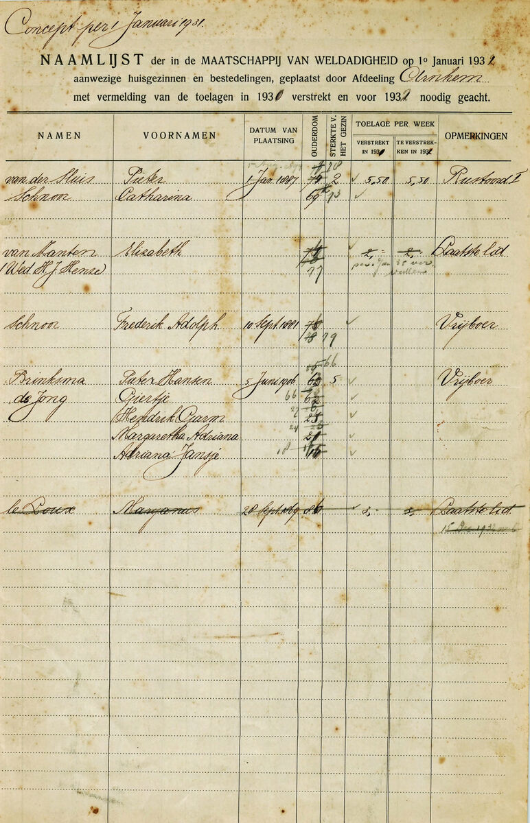 Eigenlijk was Rustoord I, zoals deze woningen genoemd werden, bedoeld voor echtparen. We weten echter dat Elizabeth er lang in haar eentje heeft gewoond. Kijk maar goed naar deze namenlijst uit 1931-1932. Daar staat op dat Elizabeth als ‘laatste lid’ van haar gezin in Rustoord I zat, nu ze weduwe was en haar kinderen allemaal allang het huis uit waren. En dat niet alleen: ze kreeg een toelage (een soort pensioen) van 2 gulden per week. Ze is dan 77 jaar oud, staat er in de kolom voor leeftijden.