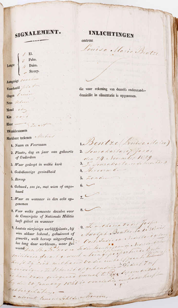 En sommige mensen kregen met allebei de soorten koloniën te maken. Louisa Maria Bentze is zo iemand. Ze wordt geboren in Solo (Surakarta), een stad midden op het eiland Java, in Nederlands-Indië (Indonesië). Op deze signalementskaart, een soort paspoort met een beschrijving van hoe iemand eruit zag (foto’s bestonden nog niet), staat allerlei informatie over haar. Kijk maar! Er staat bijvoorbeeld dat ze zwart haar had en een kleine neus en dat ze geboren is op 24 november 1829.